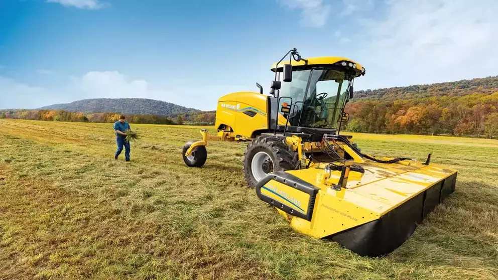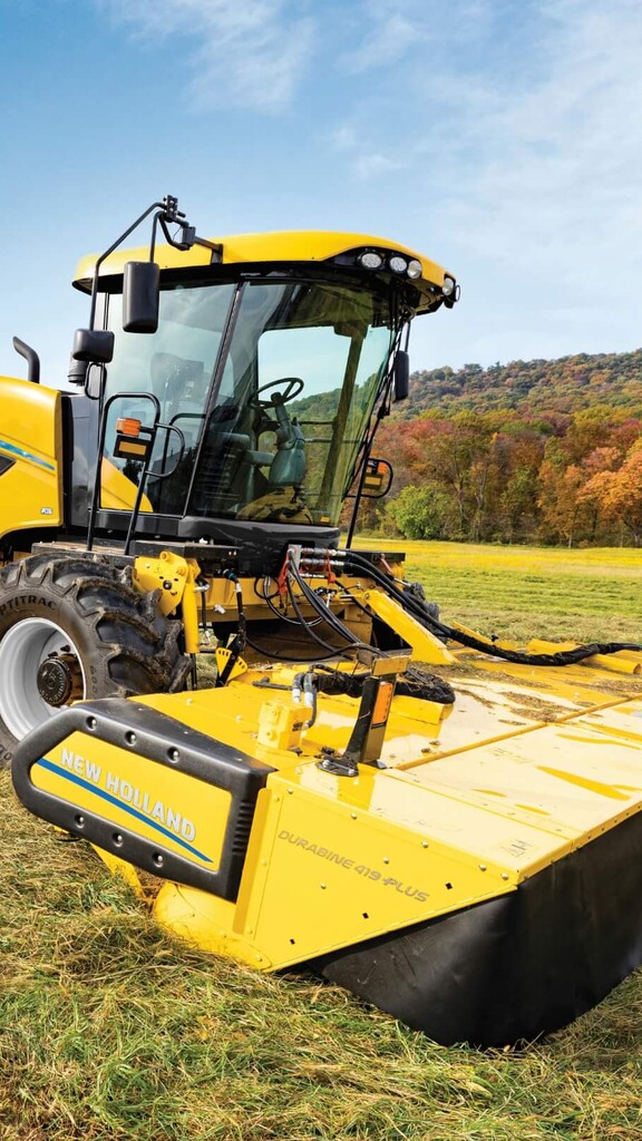 Since 1964 when New Holland introduced the industry’s first combined mower-conditioner, the Haybine® name has been associated with impeccable cutting performance, fast drying, and time-tested reliability. Three sizes are available with cutting widths of 14’ 3” (4.34 m.), 16’ 3” (4.95 m), and 18’ 3” (5.56 m). For clean cutting performance, dual counter-stroking sickles feature a timed modular wobble drive that assures smooth cutting with minimal vibration and maintenance. Over-serrated knives slice quickly at 1800 rpm as the fully adjustable five-bat reel consistently feeds crop into the 20-inch (508 mm) auger. Fast dry down is the result of 102-inch (2591 mm) wide chevron-pattern intermeshing rubber or steel rolls that use a proven torsion-bar roll-pressure system to apply constant pressure.